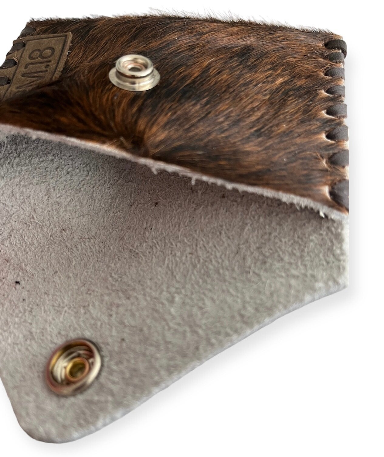 Portemonnee (handgemaakt) van echt koeienhuid. De portemonnee sluit met een drukknoop en heeft 1 vak. O.a handig voor pasjes, kleingeld en opgevouwen briefgeld.