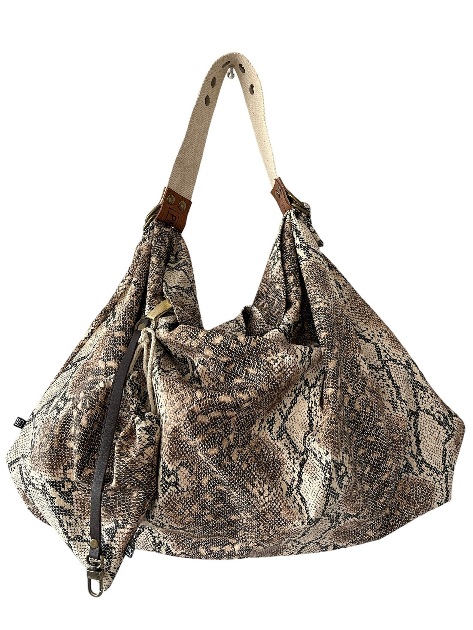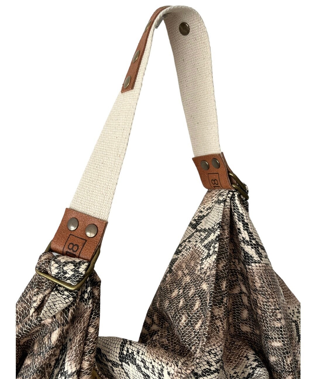 Deze stoffen tas met verwisselbare zak en canvas hengsel met leer details is handig en tegelijkerijd een aanvulling op uw outfit.