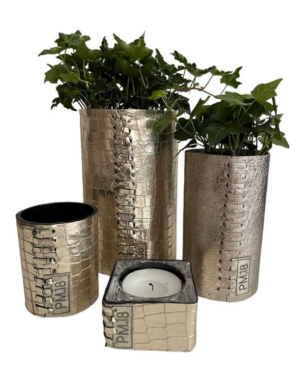 Leren Vazen/Potten van PM18, de blikvanger voor de mooiste bloemen en planten. Met hun speciale materiaal en maat vormen ze een ware eyecatcher binnen het interieur.